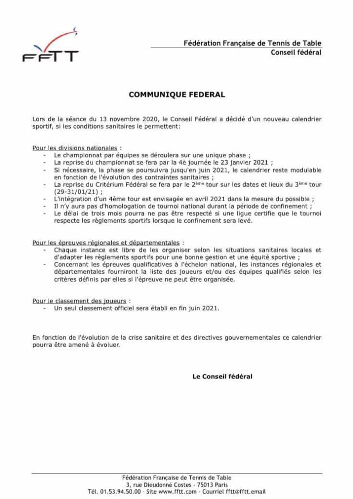 Le 13 novembre, le Conseil Fédéral s’est réuni et a pris des décisions sur une éventuelle reprise des championnats. Retrouvez ces informations dans le communiqué ci-dessous.