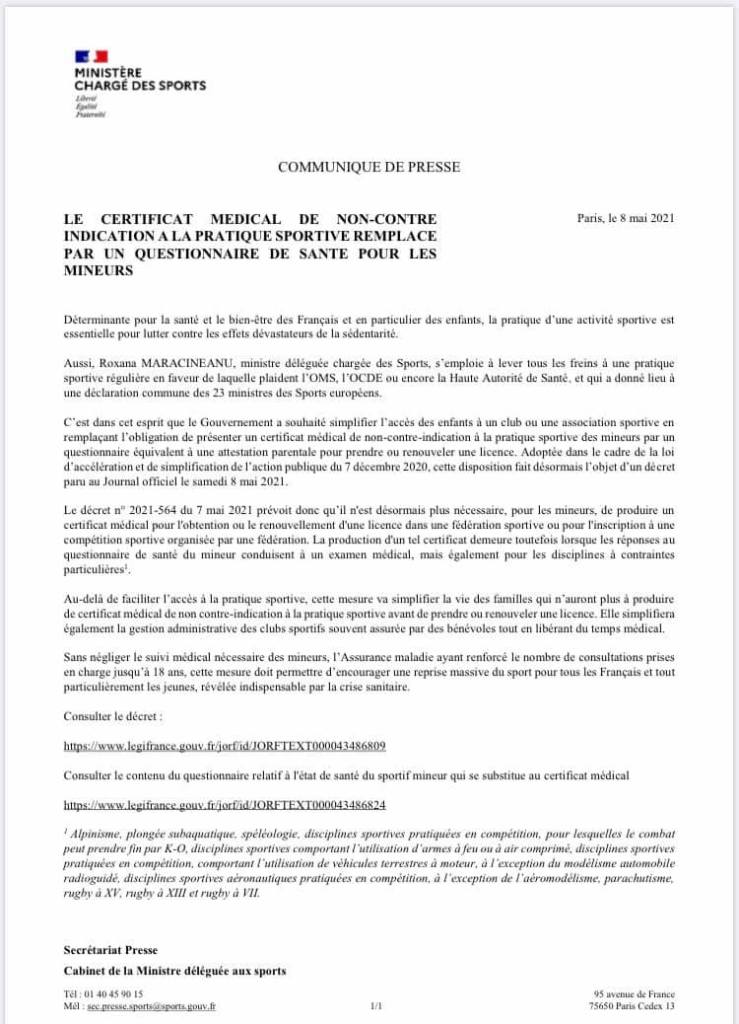 Vous trouverez ci-joint un communiqué de presse concernant le certificat médical de non-contre indication à la pratique sportive remplacé par un questionnaire de santé pour les mineurs.
